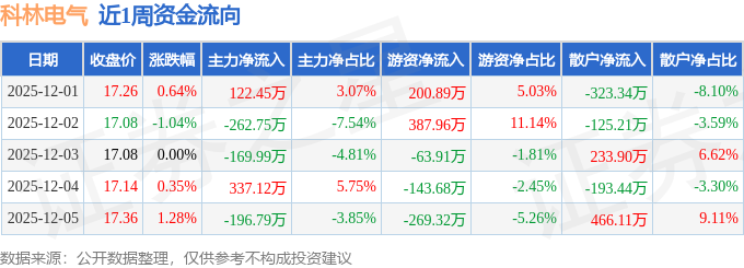 资金流向数据方面,本周科林电气主力资金合计净流出169.98万元,游资资金合计净流入111.95万元,散户资金合计净流入58.03万元。本周资金流向一览见下表: