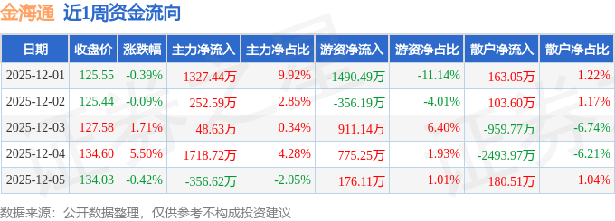 资金流向数据方面,本周金海通主力资金合计净流入2990.76万元,游资资金合计净流入15.82万元,散户资金合计净流出3006.59万元。本周资金流向一览见下表: