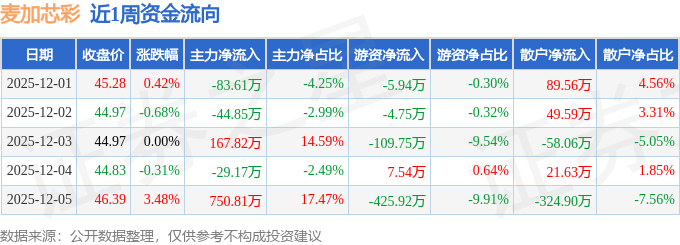 资金流向数据方面,本周麦加芯彩主力资金合计净流入761.0万元,游资资金合计净流出538.82万元,散户资金合计净流出222.18万元。本周资金流向一览见下表: