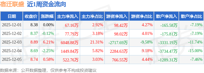 资金流向数据方面,本周宿迁联盛主力资金合计净流入8166.42万元,游资资金合计净流入529.93万元,散户资金合计净流出8696.35万元。本周资金流向一览见下表: