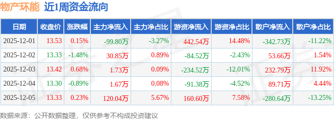 资金流向数据方面,本周物产环能主力资金合计净流入54.49万元,游资资金合计净流入192.71万元,散户资金合计净流出247.21万元。本周资金流向一览见下表: