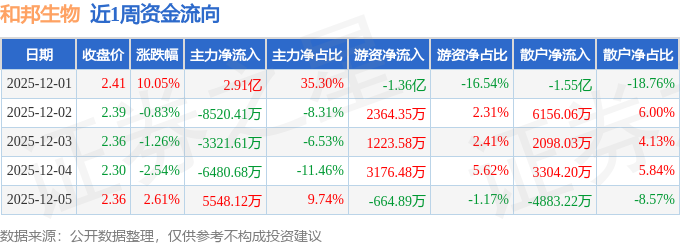 资金流向数据方面,本周和邦生物主力资金合计净流入1.64亿元,游资资金合计净流出7547.85万元,散户资金合计净流出8810.2万元。本周资金流向一览见下表: