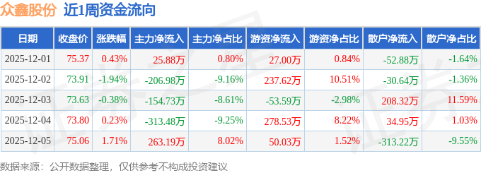 资金流向数据方面,本周众鑫股份主力资金合计净流出386.11万元,游资资金合计净流入539.58万元,散户资金合计净流出153.47万元。本周资金流向一览见下表: