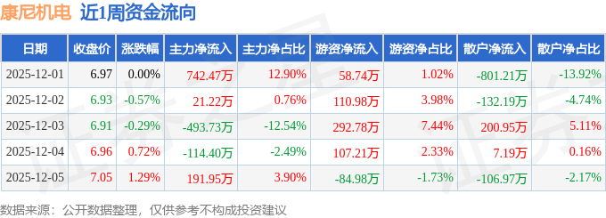 资金流向数据方面,本周康尼机电主力资金合计净流入347.5万元,游资资金合计净流入484.73万元,散户资金合计净流出832.23万元。本周资金流向一览见下表: