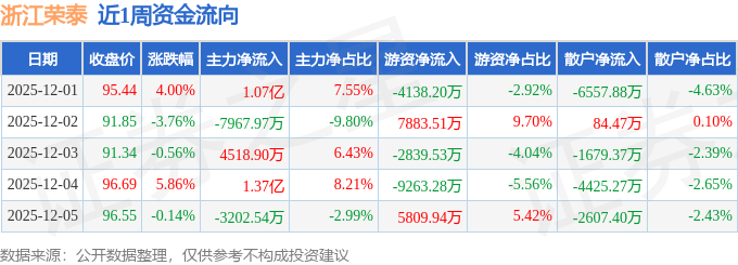 资金流向数据方面,本周浙江荣泰主力资金合计净流入1.77亿元,游资资金合计净流出2547.56万元,散户资金合计净流出1.52亿元。本周资金流向一览见下表: