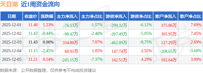资金流向数据方面,本周天目湖主力资金合计净流出24.44万元,游资资金合计净流出678.65万元,散户资金合计净流入703.1万元。本周资金流向一览见下表: