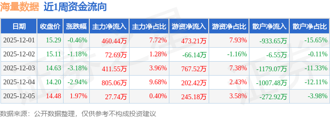 沪深股通持股方面,截止2025年12月5日收盘,海量数据沪股通持股数为233.82万股,占流通股比为83.0%。