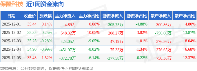 资金流向数据方面,本周保隆科技主力资金合计净流出695.58万元,游资资金合计净流出352.55万元,散户资金合计净流入1048.13万元。本周资金流向一览见下表:
