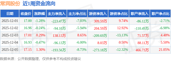 资金流向数据方面,本周常润股份主力资金合计净流出469.13万元,游资资金合计净流入39.33万元,散户资金合计净流入429.8万元。本周资金流向一览见下表: