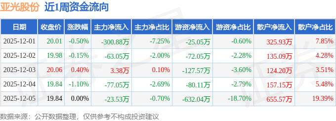 资金流向数据方面,本周亚光股份主力资金合计净流出461.13万元,游资资金合计净流出936.82万元,散户资金合计净流入1397.95万元。本周资金流向一览见下表: