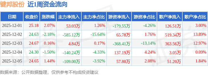 资金流向数据方面,本周键邦股份主力资金合计净流出776.49万元,游资资金合计净流出287.18万元,散户资金合计净流入1063.67万元。本周资金流向一览见下表: