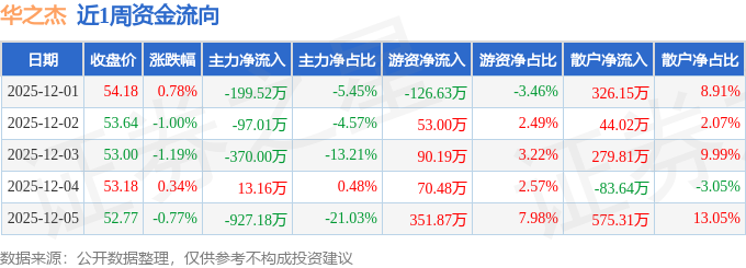 资金流向数据方面,本周华之杰主力资金合计净流出1580.55万元,游资资金合计净流入438.91万元,散户资金合计净流入1141.64万元。本周资金流向一览见下表: