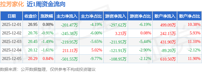 资金流向数据方面,本周拉芳家化主力资金合计净流出957.23万元,游资资金合计净流出737.21万元,散户资金合计净流入1694.44万元。本周资金流向一览见下表: