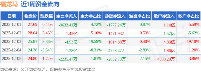 资金流向数据方面,本周福龙马主力资金合计净流出6.06亿元,游资资金合计净流出6741.64万元,散户资金合计净流入6.74亿元。本周资金流向一览见下表: