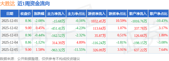 资金流向数据方面,本周大胜达主力资金合计净流出1278.55万元,游资资金合计净流入1391.8万元,散户资金合计净流出113.25万元。本周资金流向一览见下表: