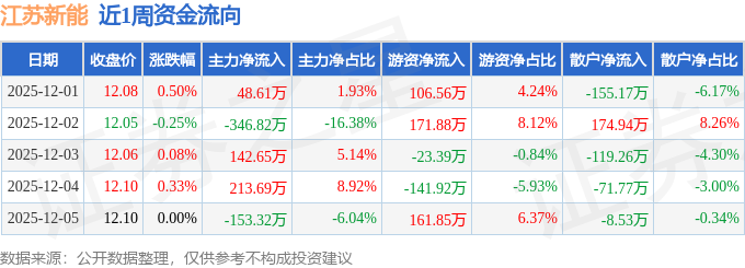 资金流向数据方面,本周江苏新能主力资金合计净流出95.19万元,游资资金合计净流入274.98万元,散户资金合计净流出179.79万元。本周资金流向一览见下表: