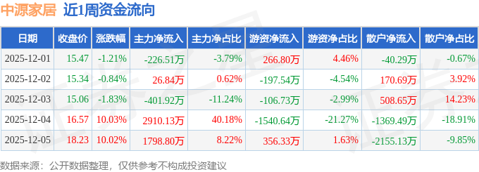 资金流向数据方面,本周中源家居主力资金合计净流入4107.33万元,游资资金合计净流出1221.77万元,散户资金合计净流出2885.56万元。本周资金流向一览见下表:
