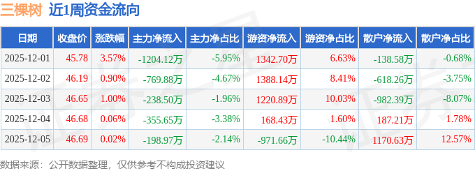 资金流向数据方面,本周三棵树主力资金合计净流出2767.12万元,游资资金合计净流入3148.51万元,散户资金合计净流出381.39万元。本周资金流向一览见下表: