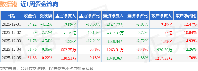 资金流向数据方面,本周数据港主力资金合计净流出4.69亿元,游资资金合计净流出8493.08万元,散户资金合计净流入5.54亿元。本周资金流向一览见下表: