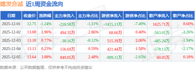 资金流向数据方面,本周建发合诚主力资金合计净流入1259.35万元,游资资金合计净流出1318.75万元,散户资金合计净流入59.4万元。本周资金流向一览见下表: