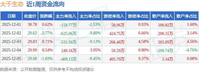 资金流向数据方面,本周大千生态主力资金合计净流出1476.3万元,游资资金合计净流入1206.49万元,散户资金合计净流入269.81万元。本周资金流向一览见下表: