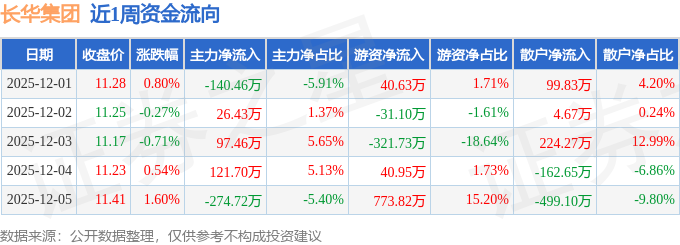 资金流向数据方面,本周长华集团主力资金合计净流出169.59万元,游资资金合计净流入502.58万元,散户资金合计净流出332.99万元。本周资金流向一览见下表: