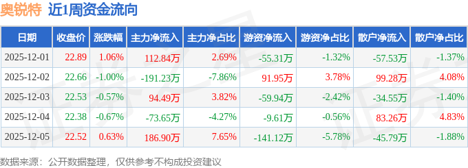 资金流向数据方面,本周奥锐特主力资金合计净流入129.36万元,游资资金合计净流出174.04万元,散户资金合计净流入44.68万元。本周资金流向一览见下表: