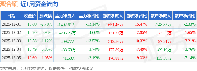 资金流向数据方面,本周聚合顺主力资金合计净流出2147.82万元,游资资金合计净流入2450.51万元,散户资金合计净流出302.7万元。本周资金流向一览见下表: