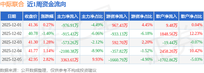 资金流向数据方面,本周中际联合主力资金合计净流出1202.34万元,游资资金合计净流出1391.61万元,散户资金合计净流入2593.95万元。本周资金流向一览见下表: