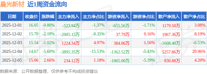 资金流向数据方面,本周晨光新材主力资金合计净流出4965.97万元,游资资金合计净流出2661.23万元,散户资金合计净流入7627.19万元。本周资金流向一览见下表: