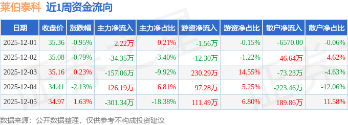 资金流向数据方面,本周莱伯泰科主力资金合计净流出364.35万元,游资资金合计净流入425.2万元,散户资金合计净流出60.86万元。本周资金流向一览见下表: