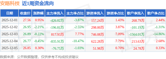 资金流向数据方面,本周安路科技主力资金合计净流出717.56万元,游资资金合计净流入1875.57万元,散户资金合计净流出1158.01万元。本周资金流向一览见下表: