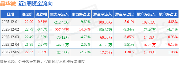 资金流向数据方面,本周晶华微主力资金合计净流出139.02万元,游资资金合计净流出24.42万元,散户资金合计净流入163.44万元。本周资金流向一览见下表: