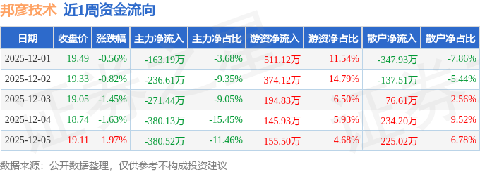 资金流向数据方面,本周邦彦技术主力资金合计净流出1431.89万元,游资资金合计净流入1381.5万元,散户资金合计净流入50.4万元。本周资金流向一览见下表: