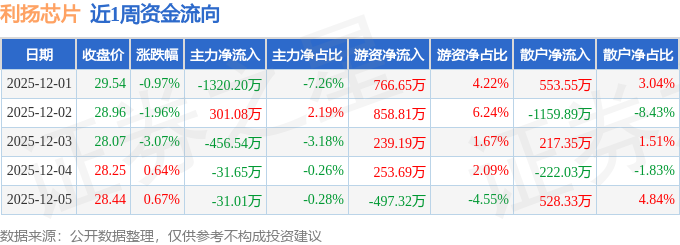资金流向数据方面,本周利扬芯片主力资金合计净流出1538.32万元,游资资金合计净流入1621.01万元,散户资金合计净流出82.7万元。本周资金流向一览见下表: