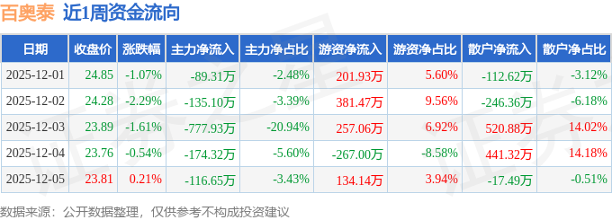 资金流向数据方面,本周百奥泰主力资金合计净流出1293.32万元,游资资金合计净流入707.6万元,散户资金合计净流入585.72万元。本周资金流向一览见下表: