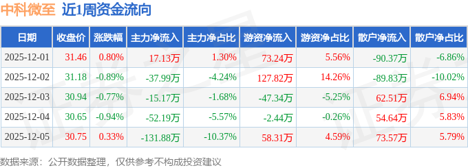 资金流向数据方面,本周中科微至主力资金合计净流出220.09万元,游资资金合计净流入209.58万元,散户资金合计净流入10.52万元。本周资金流向一览见下表: