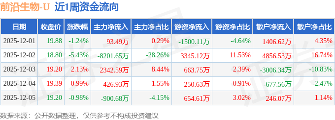资金流向数据方面,本周前沿生物主力资金合计净流出6239.31万元,游资资金合计净流入3414.0万元,散户资金合计净流入2825.31万元。本周资金流向一览见下表: