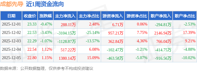 资金流向数据方面,本周成都先导主力资金合计净流出2047.55万元,游资资金合计净流入760.7万元,散户资金合计净流入1286.85万元。本周资金流向一览见下表: