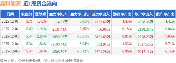 资金流向数据方面,本周晶科能源主力资金合计净流出1.04亿元,游资资金合计净流入8245.34万元,散户资金合计净流入2184.24万元。本周资金流向一览见下表: