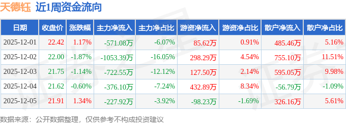 资金流向数据方面,本周天德钰主力资金合计净流出2951.05万元,游资资金合计净流入846.07万元,散户资金合计净流入2104.99万元。本周资金流向一览见下表: