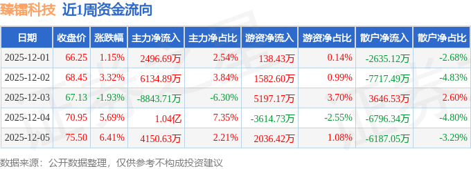 资金流向数据方面,本周臻镭科技主力资金合计净流入1.43亿元,游资资金合计净流入5339.9万元,散户资金合计净流出1.97亿元。本周资金流向一览见下表: