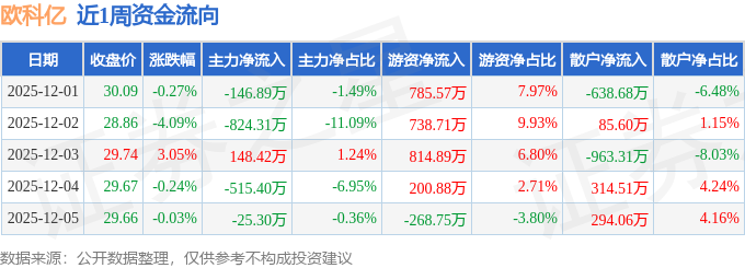 资金流向数据方面,本周欧科亿主力资金合计净流出1363.47万元,游资资金合计净流入2271.3万元,散户资金合计净流出907.82万元。本周资金流向一览见下表: