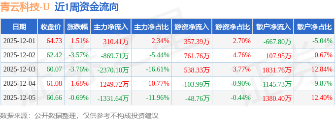 资金流向数据方面,本周青云科技主力资金合计净流出3011.32万元,游资资金合计净流入1504.73万元,散户资金合计净流入1506.58万元。本周资金流向一览见下表:
