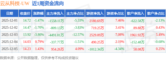 资金流向数据方面,本周云从科技主力资金合计净流出6241.76万元,游资资金合计净流入4906.95万元,散户资金合计净流入1334.82万元。本周资金流向一览见下表: