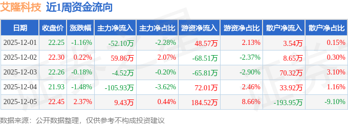 资金流向数据方面,本周艾隆科技主力资金合计净流出93.26万元,游资资金合计净流入170.78万元,散户资金合计净流出77.52万元。本周资金流向一览见下表:
