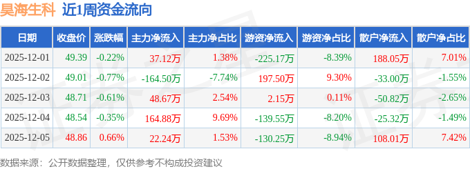 资金流向数据方面,本周昊海生科主力资金合计净流入108.4万元,游资资金合计净流出295.32万元,散户资金合计净流入186.91万元。本周资金流向一览见下表: