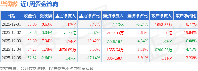 资金流向数据方面,本周华润微主力资金合计净流入402.86万元,游资资金合计净流出1.15亿元,散户资金合计净流入1.11亿元。本周资金流向一览见下表: