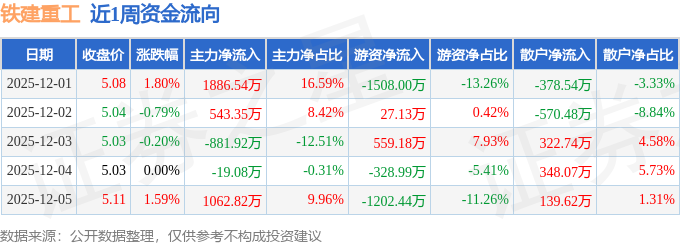 资金流向数据方面,本周铁建重工主力资金合计净流入2591.7万元,游资资金合计净流出2453.12万元,散户资金合计净流出138.58万元。本周资金流向一览见下表: