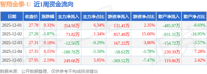 资金流向数据方面,本周智翔金泰主力资金合计净流入484.79万元,游资资金合计净流入727.96万元,散户资金合计净流出1212.75万元。本周资金流向一览见下表: